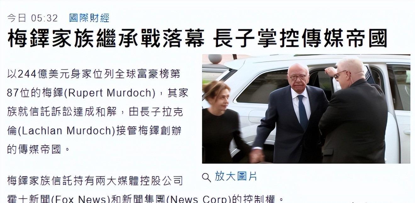 9月8日,传媒帝国默多克家族的遗产分割完毕。家里的传媒帝国由长子拉克兰继续掌权,而剩余的子女每人分得20多亿美元,放弃集团继承权。