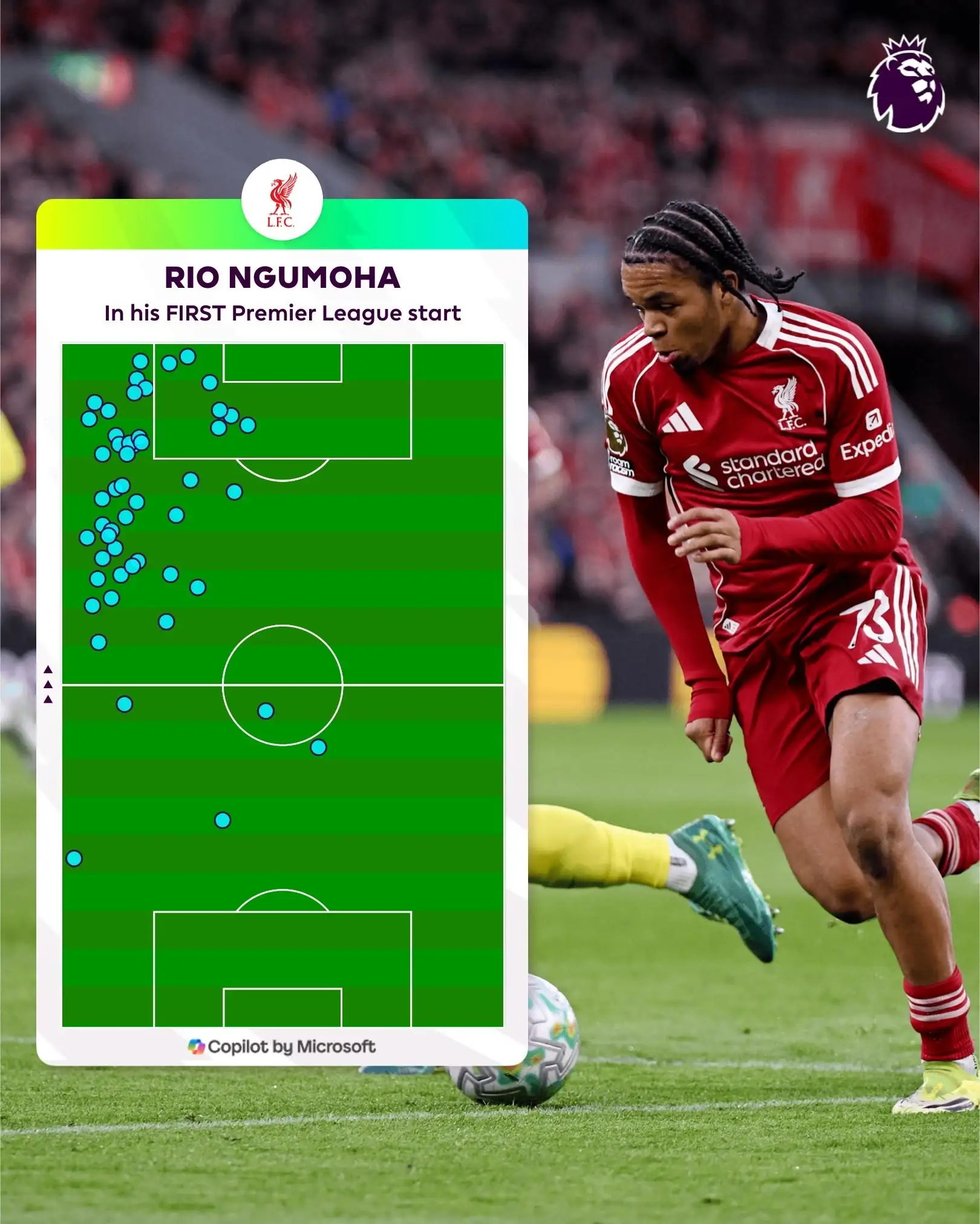 赛后,英超官方也为他制作了他本场的触球点位图,其中大部分触球都位于左路进攻走廊。